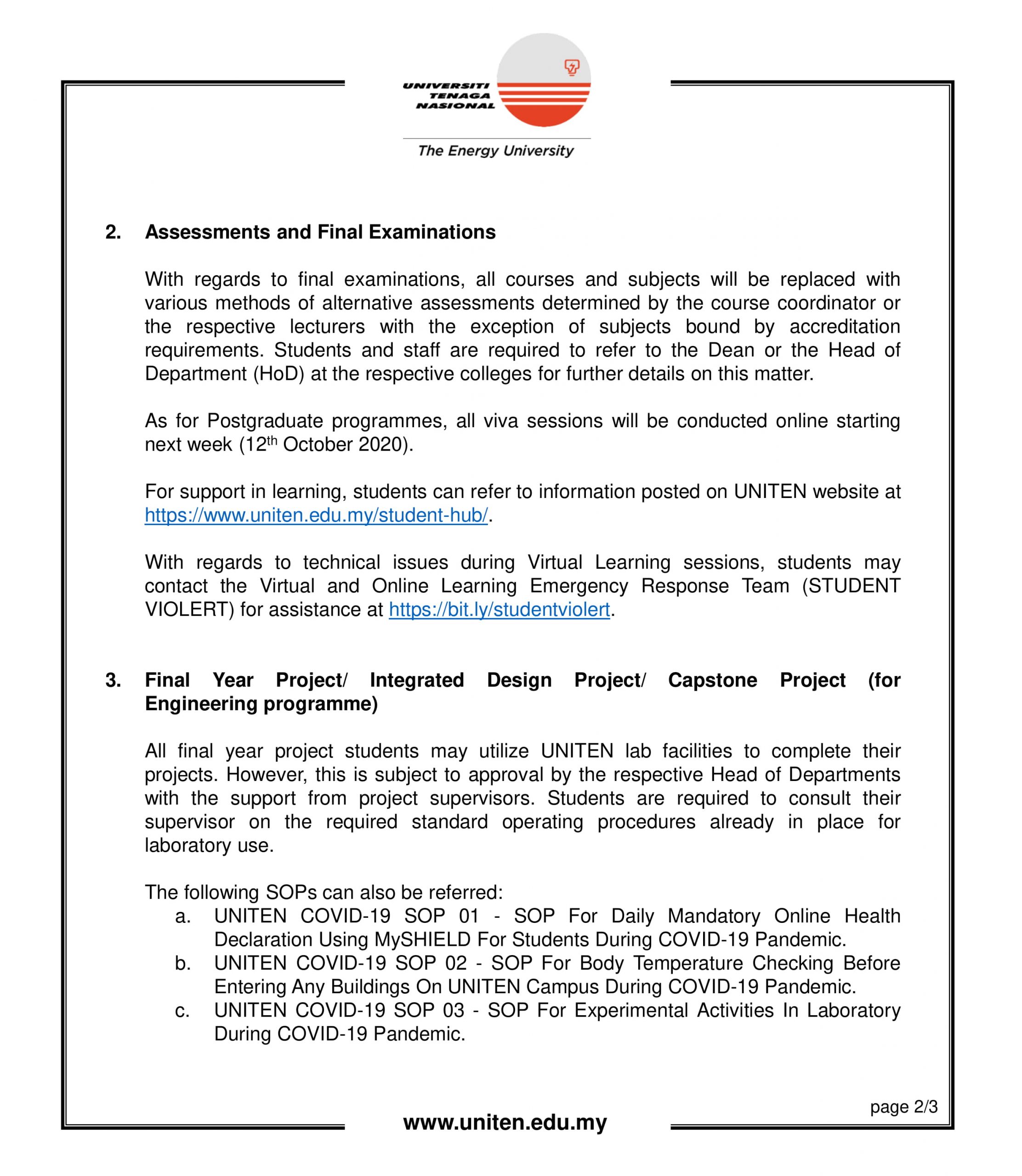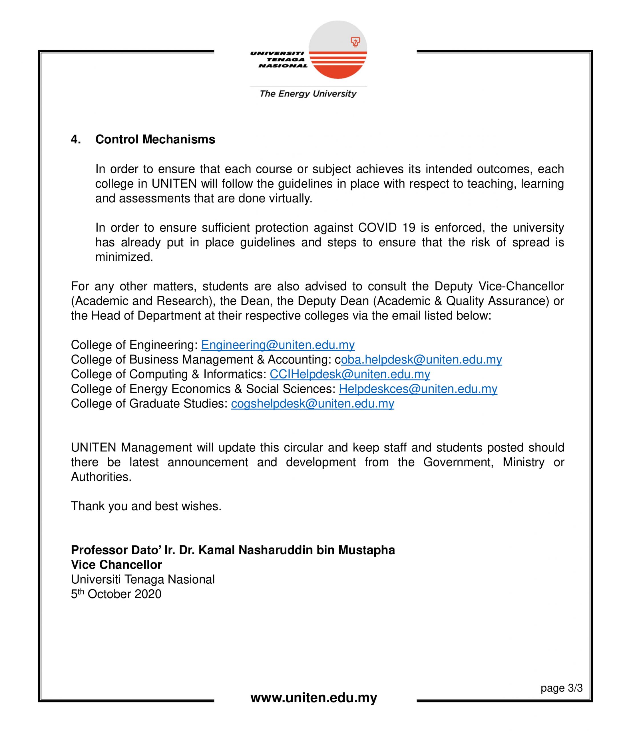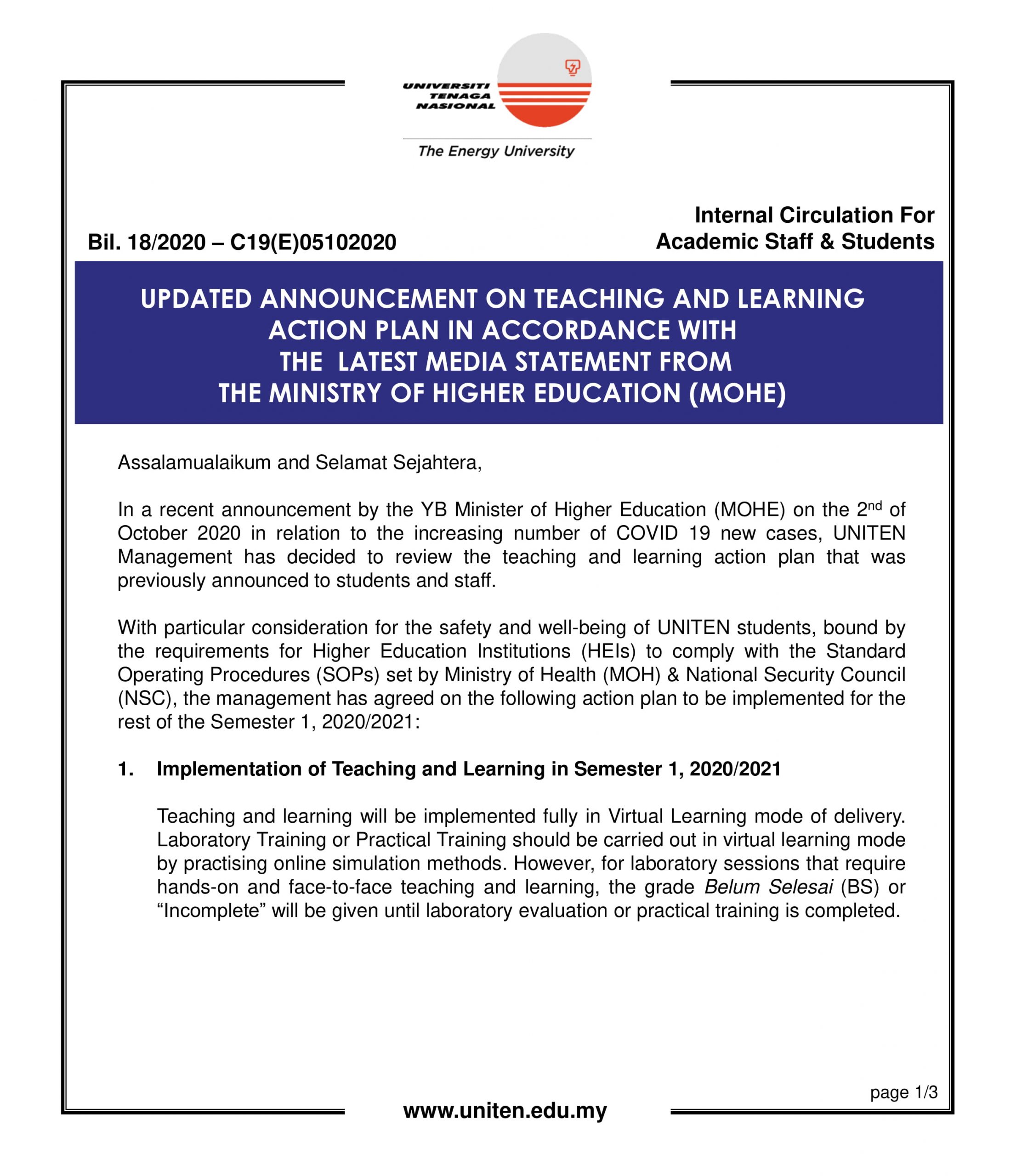 With the recent increase in Covid-19 cases, UNITEN has released a circular concerning all UNITEN students. Please read through the circular attached.
