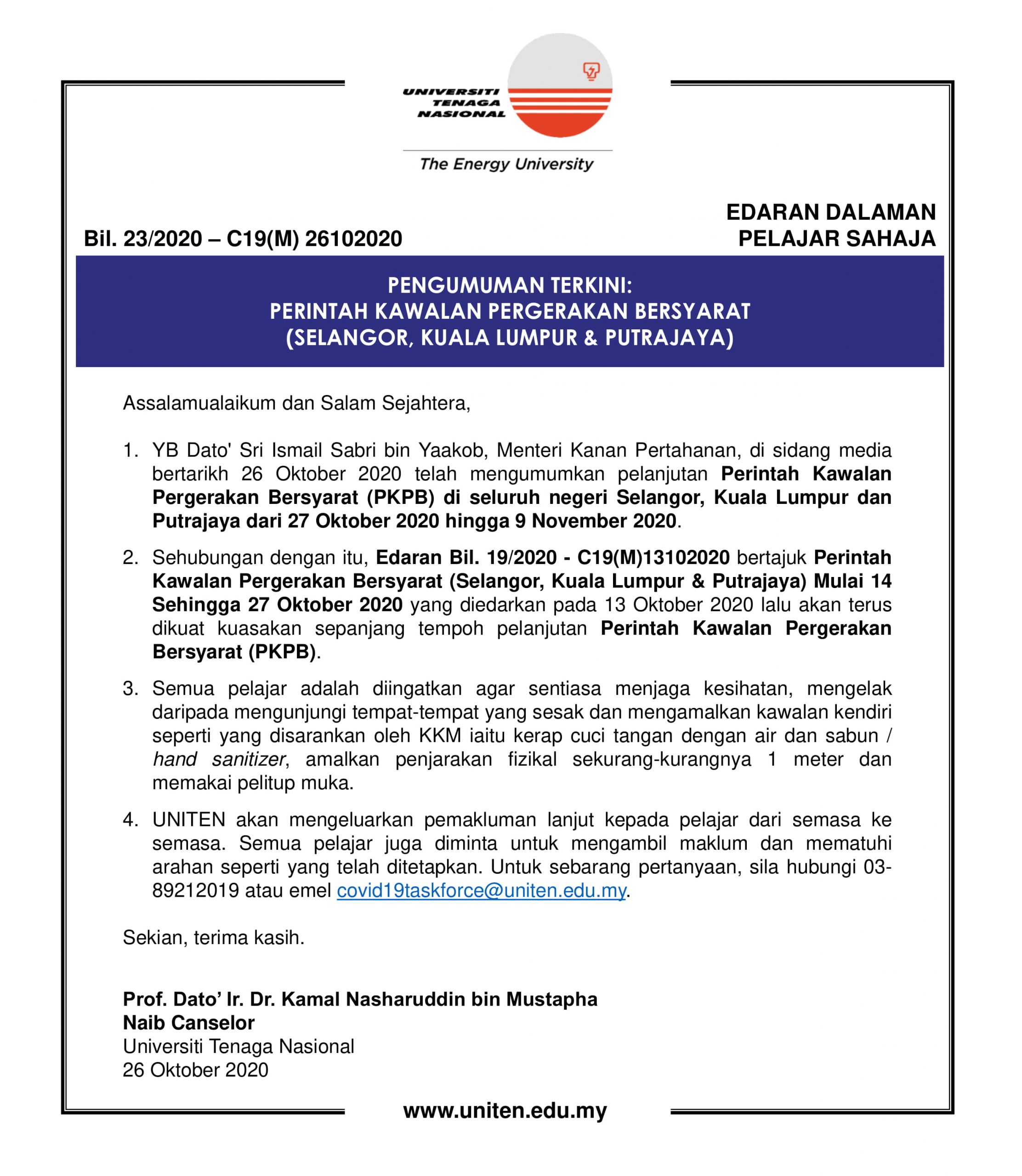 In regards with the extension of CMCO (PKPB) in Selangor, Kuala Lumpur and Putrajaya, we would like to inform everyone regarding the implementation of the SOP and Operation of UNITEN Gate 2 to be continued until 9th of November 2020.